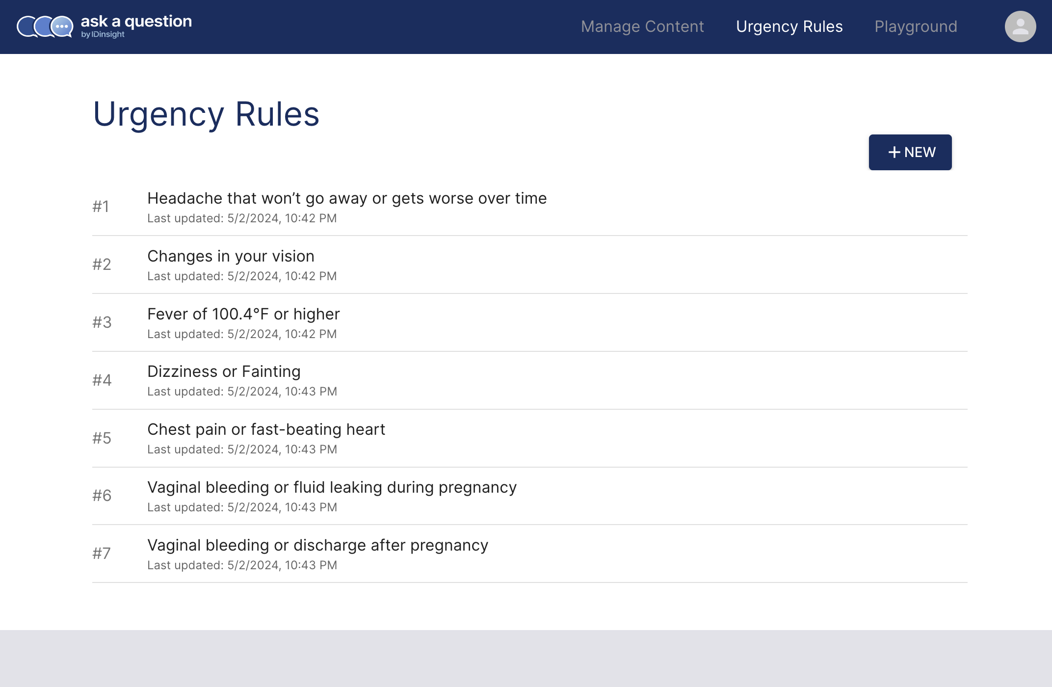 Using the Admin App, you can define your rules in natural language. For example, here are a few rules borrowed directly from the CDC website on Urgent Maternal Warning Signs: