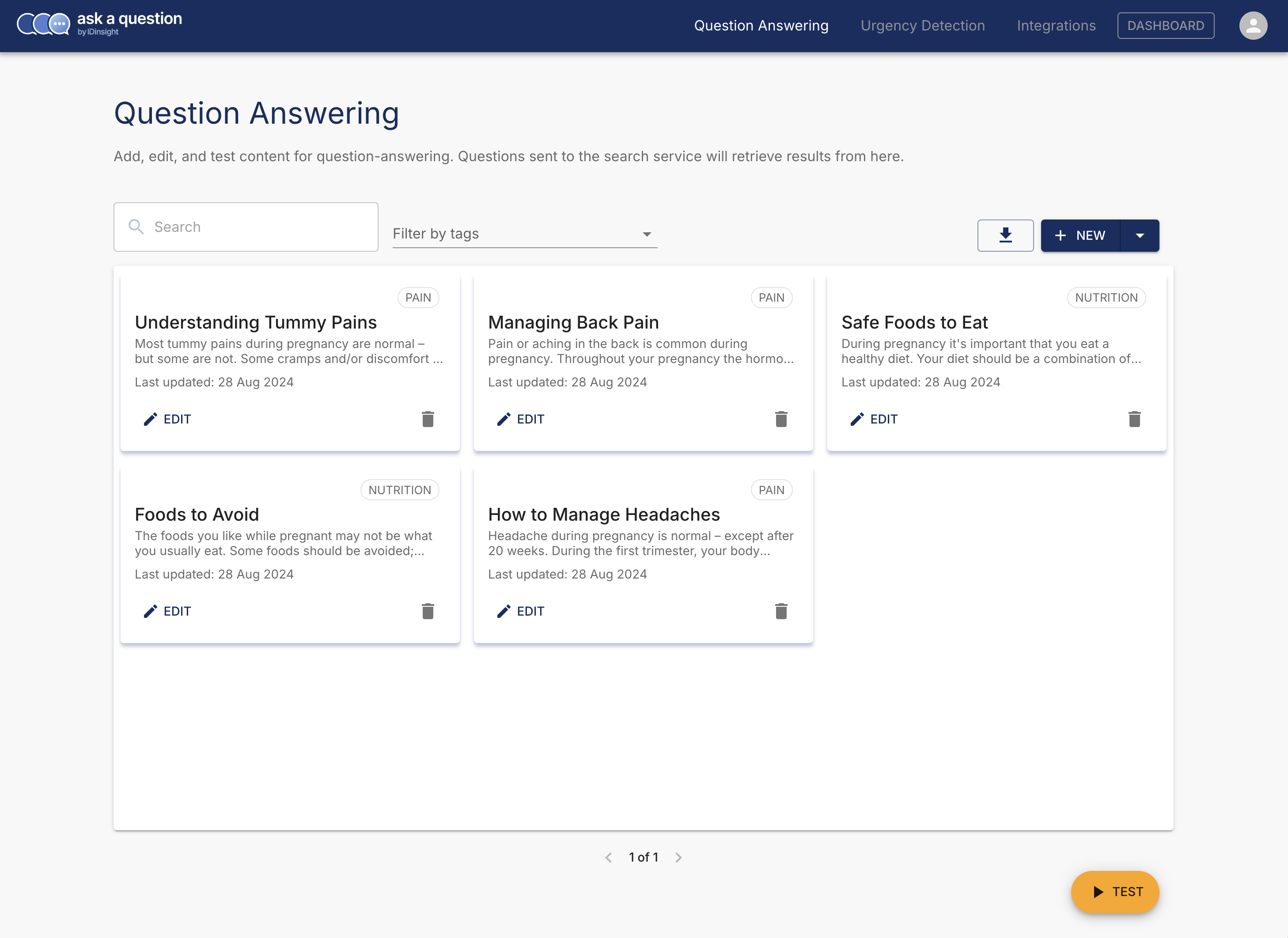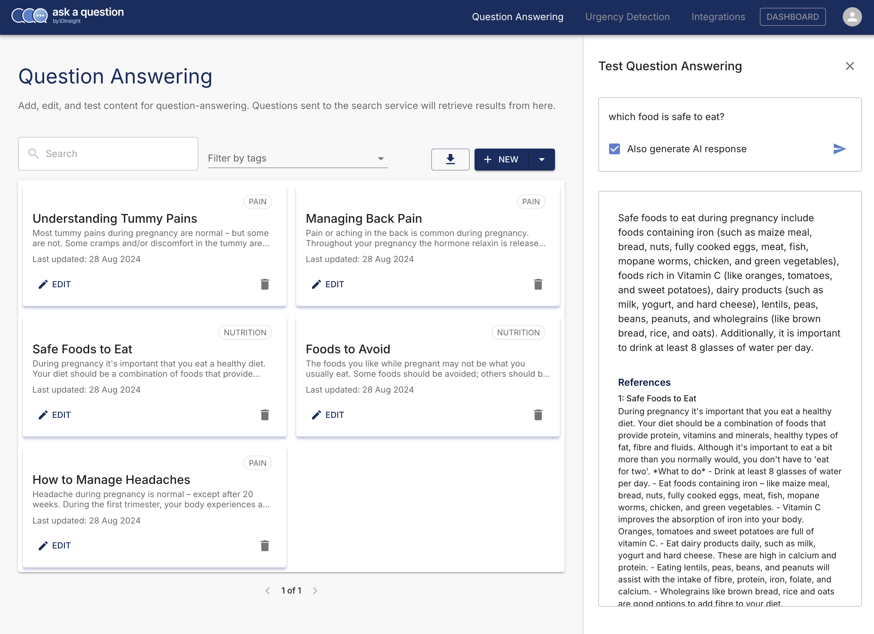The Admin app allows you to view, add, edit, or delete content in the database. It also allows you to test the service with questions to ensure the correct responses are fetched before releasing the service to your users.
