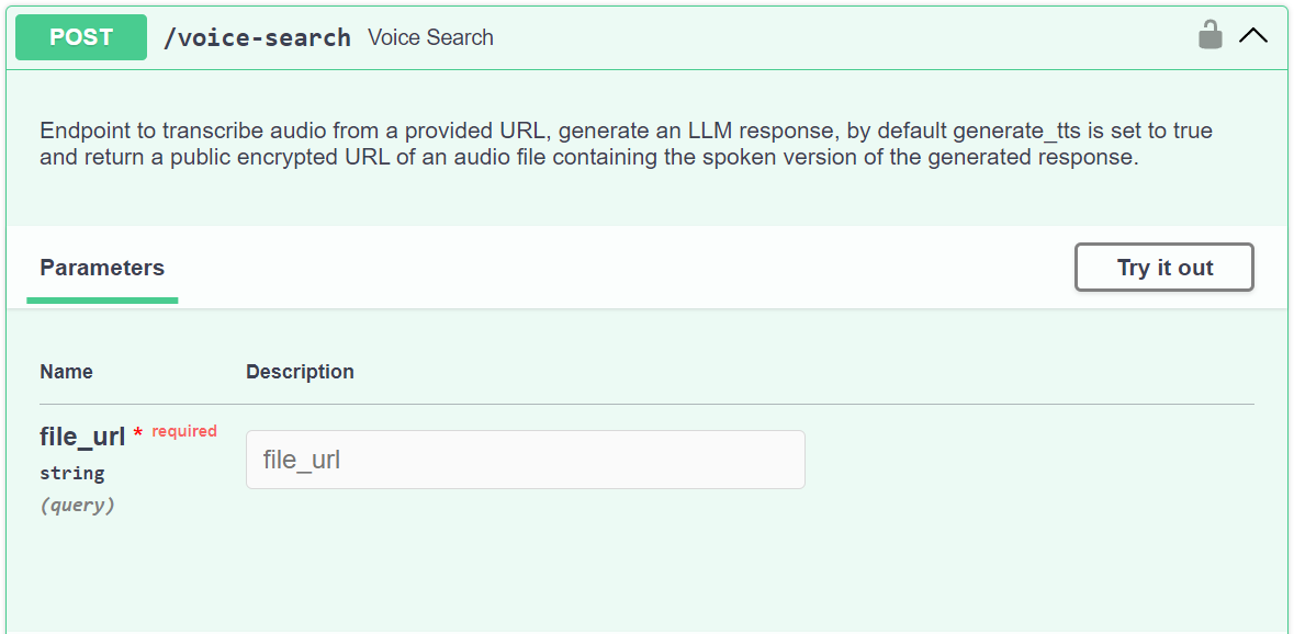 This service accepts an audio file URL, transcribes the speech to text, processes the query similar to the text-based search, and returns both a text response and an audio response URL.