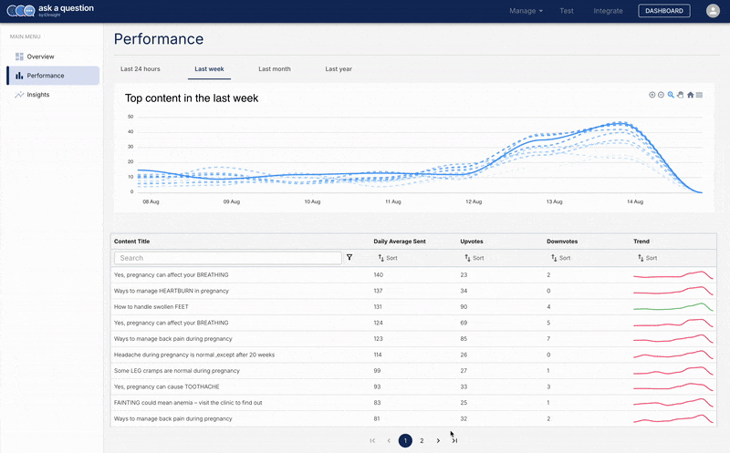 The "Performance" page allows for just that. It lets you see which contents are being shared, and the feedback each is receiving. Using AI, we are able to summarize user feedback and suggest ways to improve the content.